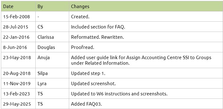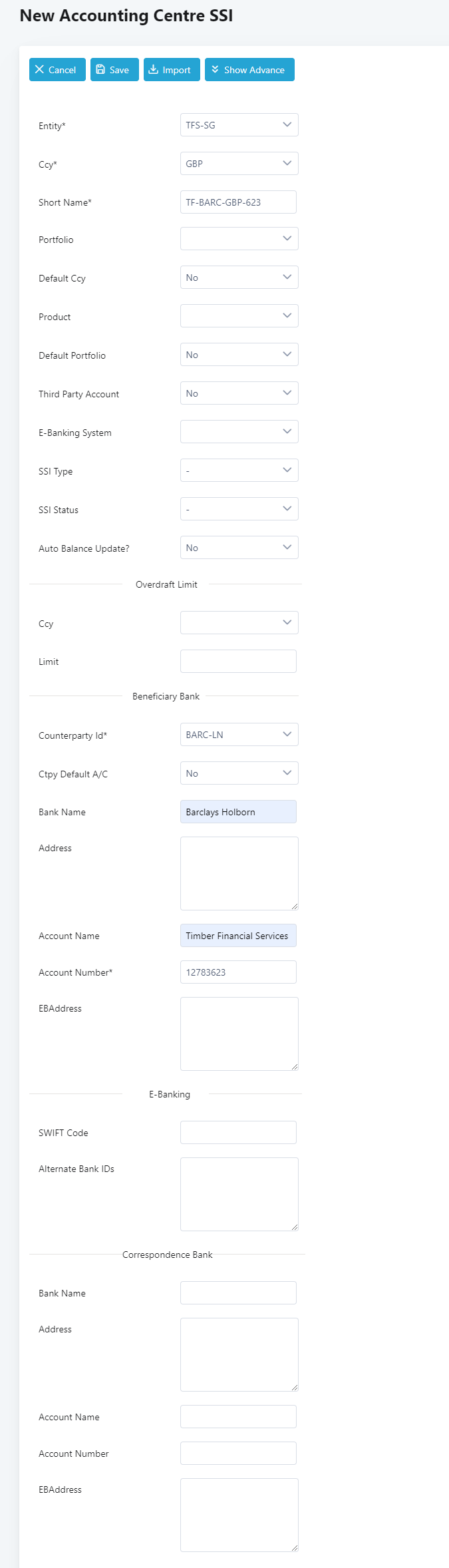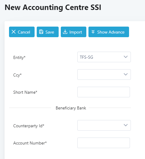 2. Click on Action and select New SSI. The New Accounting Centre SSI page will be displayed.