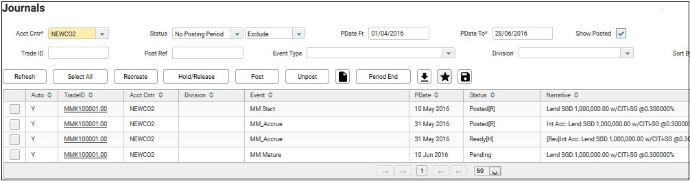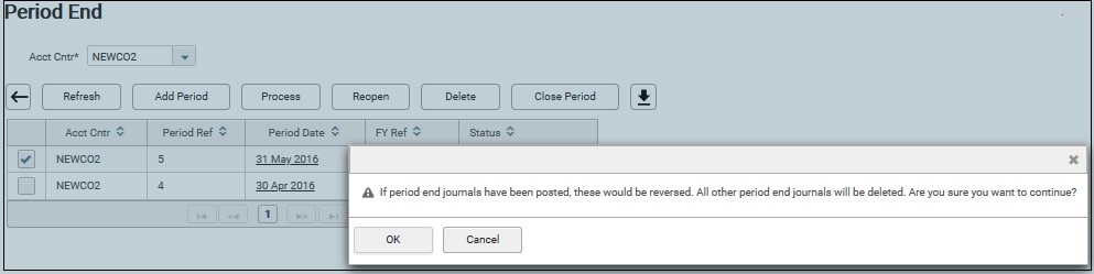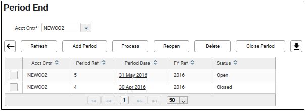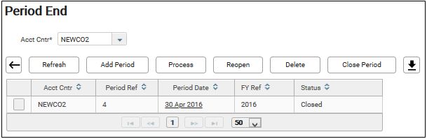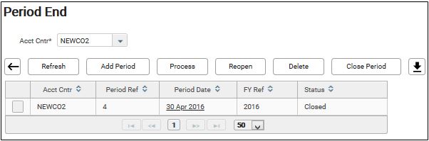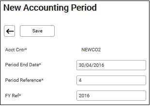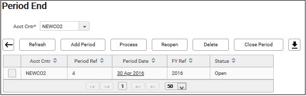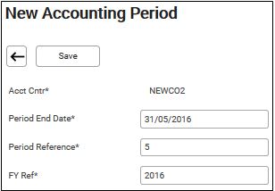 Important note: To start accounting posting for a newly created Accounting Centre, the first accounting period must be closed. For example, if the new accounting centre wants to start posting on 1-May-2016, a prior period end, 30-Apr-2016 needs to be created and set to closed.