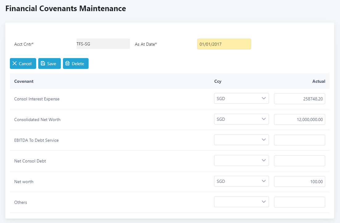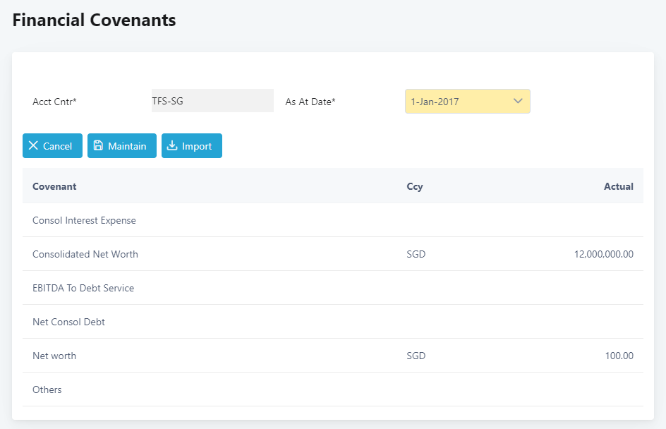 3. From the Amend Accounting Centre screen, click Financial Covenants. You will see last available actual financial covenants on the screen, i.e. actual financial covenants as at 1 Jan 2017. If no actual financial covenants maintained before, you will see blank.