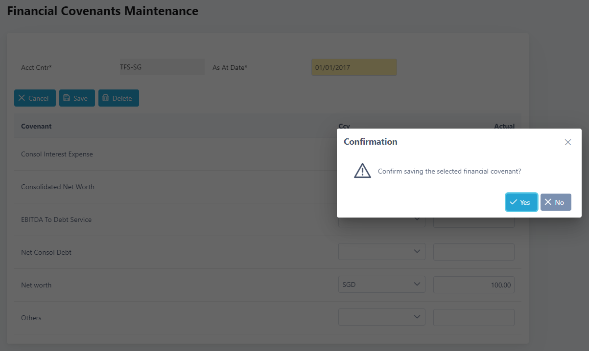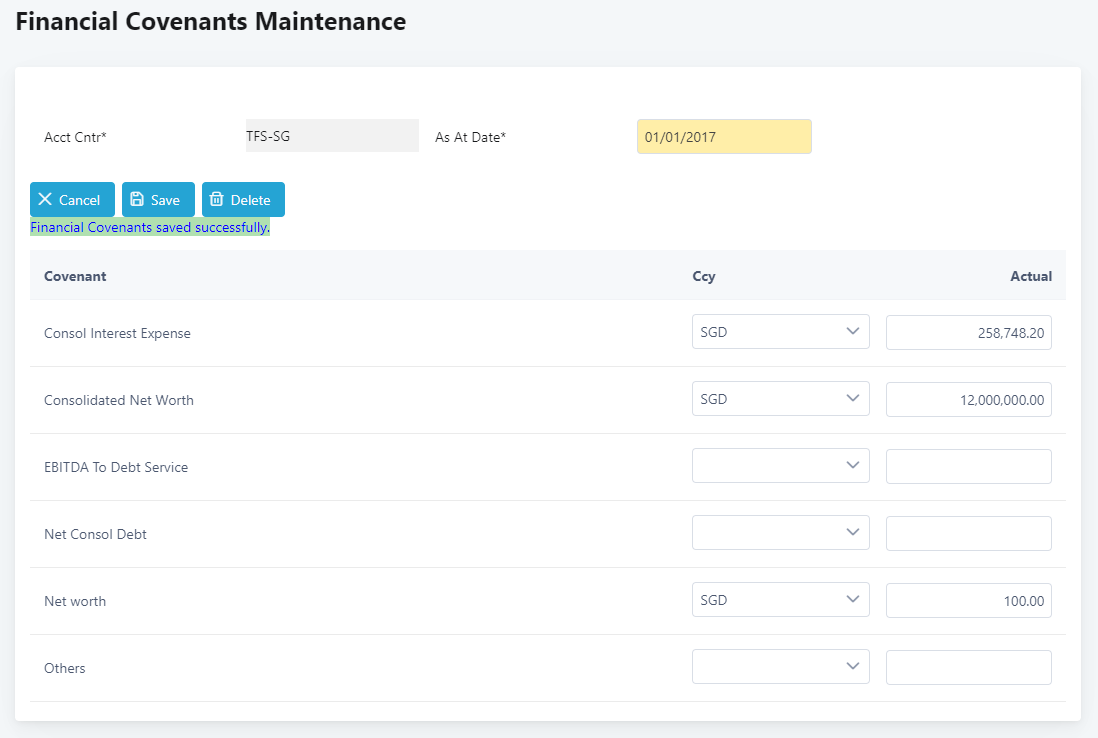 9. A message showing the financial covenants are saved successfully will be displayed.