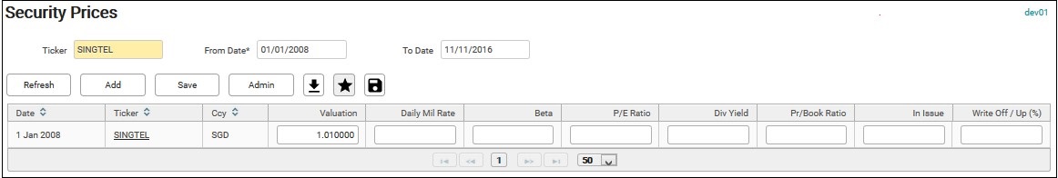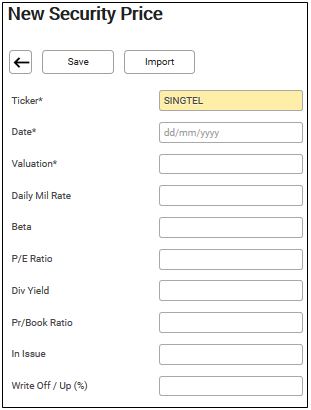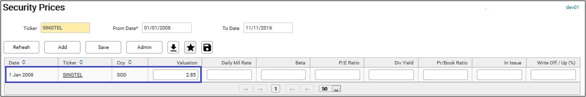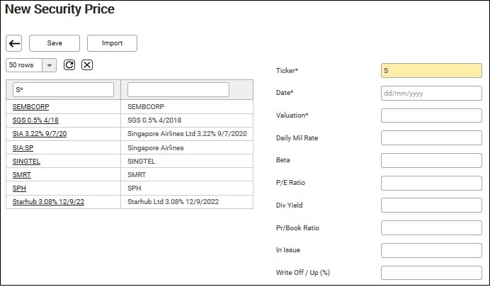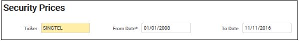 8. To maintain Security Prices, from the main screen, choose the ticker of what needs maintenance. In this example, SINGTEL will be chosen.