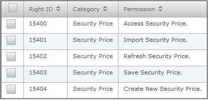 Authorization is needed add and maintain security prices. Contact your administrator to grant you rights. Access rights for Security Price as below.