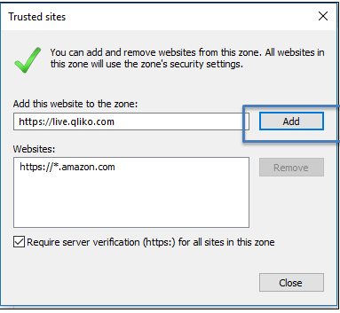 5. Click Add to add the CS Lucas system URL to trusted sites.