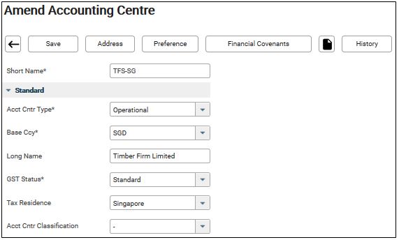 3. The Amend Accounting Centre screen is displayed.
