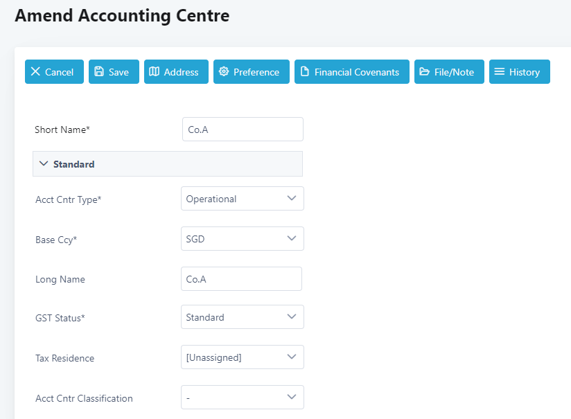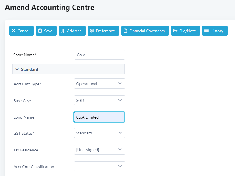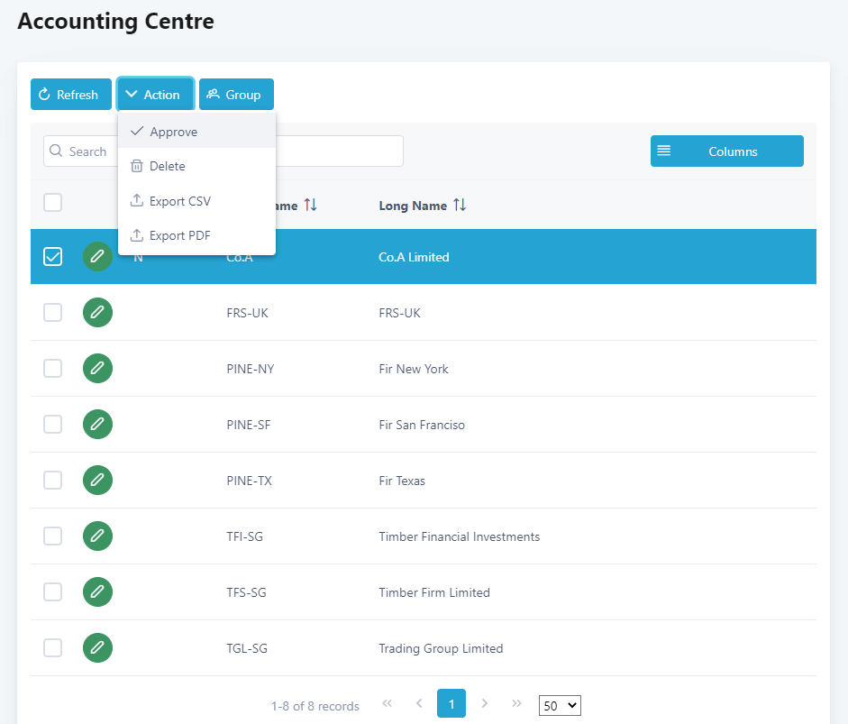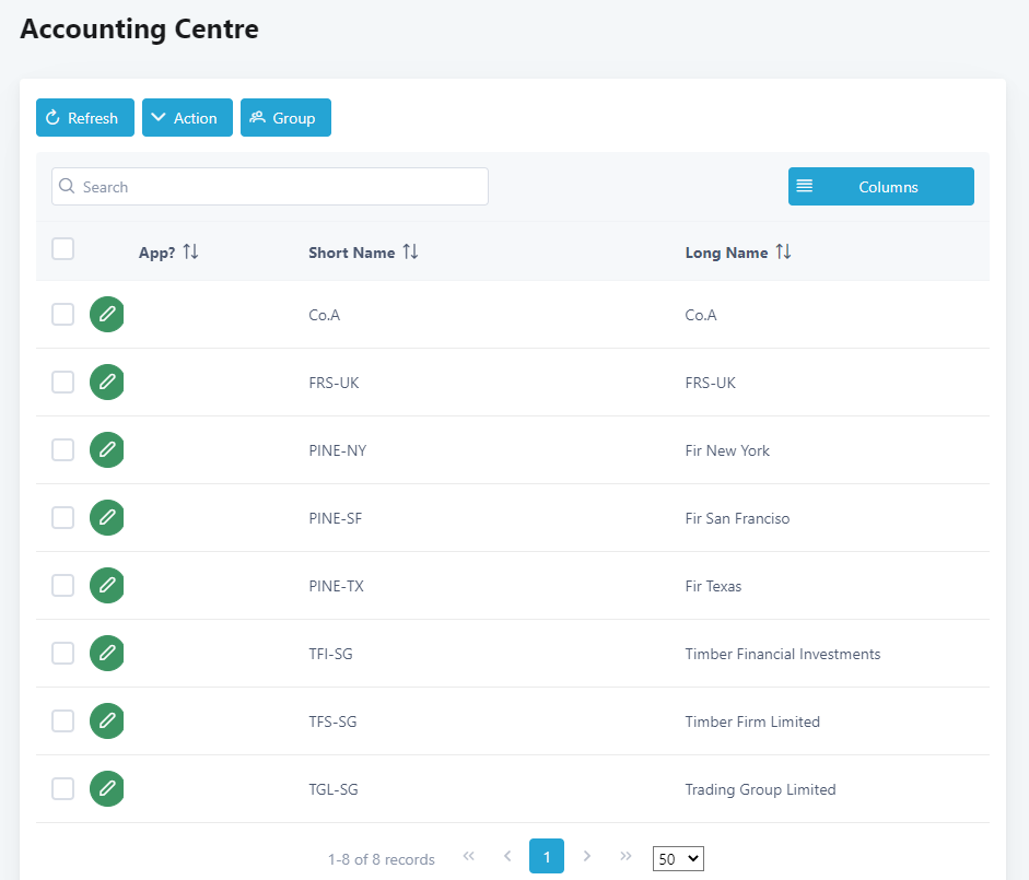 2. Click on the Edit button next to the accounting centre short name to amend. In this example, Co.A will be selected.