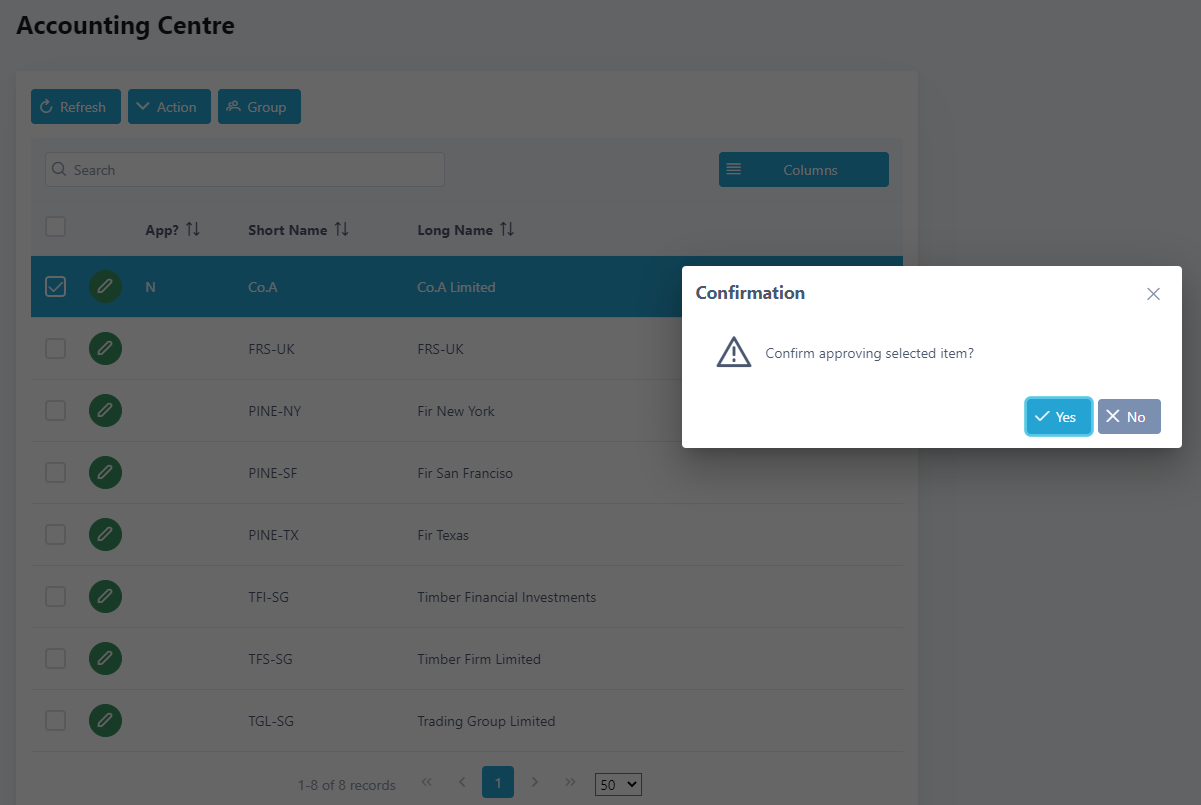 6. The accounting centre needs to be approved for the changes to take effect. To do this, click on the tickbox beside the Accounting centre’s short name.