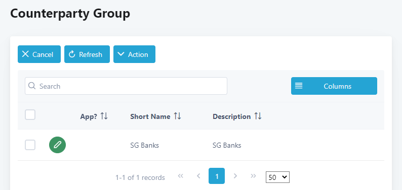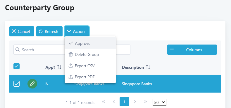 16. Approve the counterparty group by ticking the checkbox beside the short name and click Action and Approve . If you do not see approval status set to “N” after making changes for the counterparty group, click Refresh to refresh the screen.