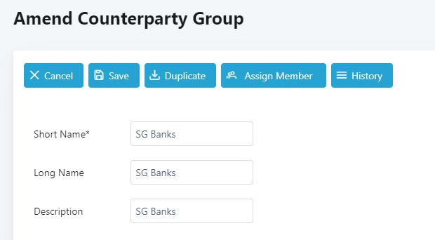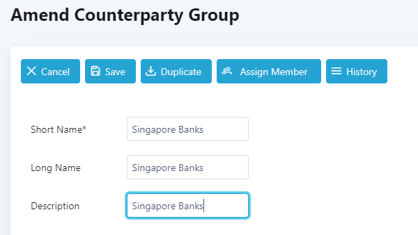 15. Click Save when completed. You will be returned to Amend Counterparty Group screen, click Cancel button to return to Counterparty Group screen.