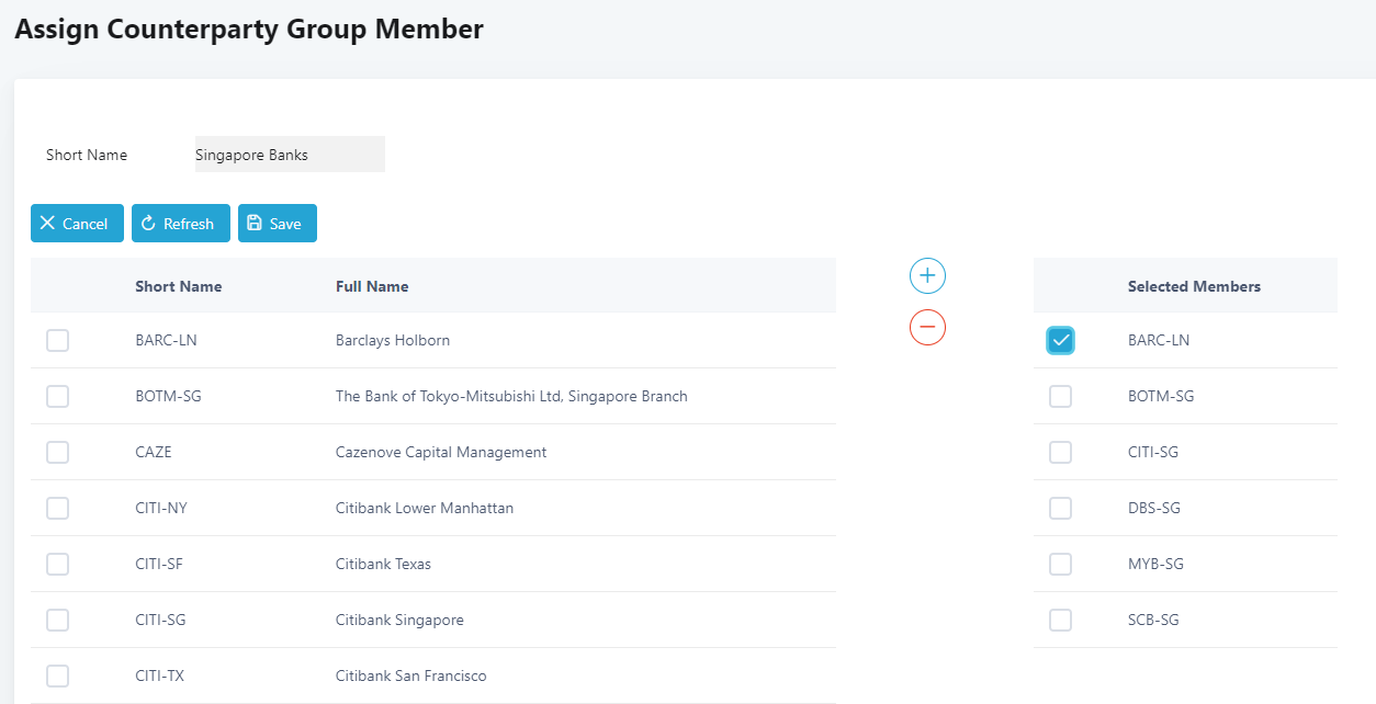14. Click Remove . Counterparty selected will be removed from the Selected Members list on the right.