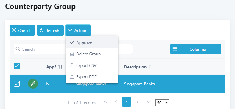 7. Approve the amended counterparty group by ticking the checkbox beside the short name and click Action and Approve.