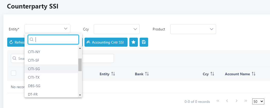 2 . From the Counterparty SSI screen, choose the counterparty to change by choosing the short name from the Entity dropdown.