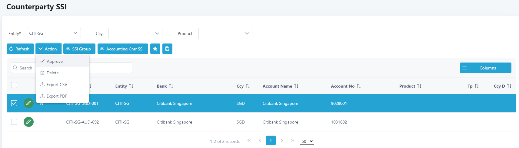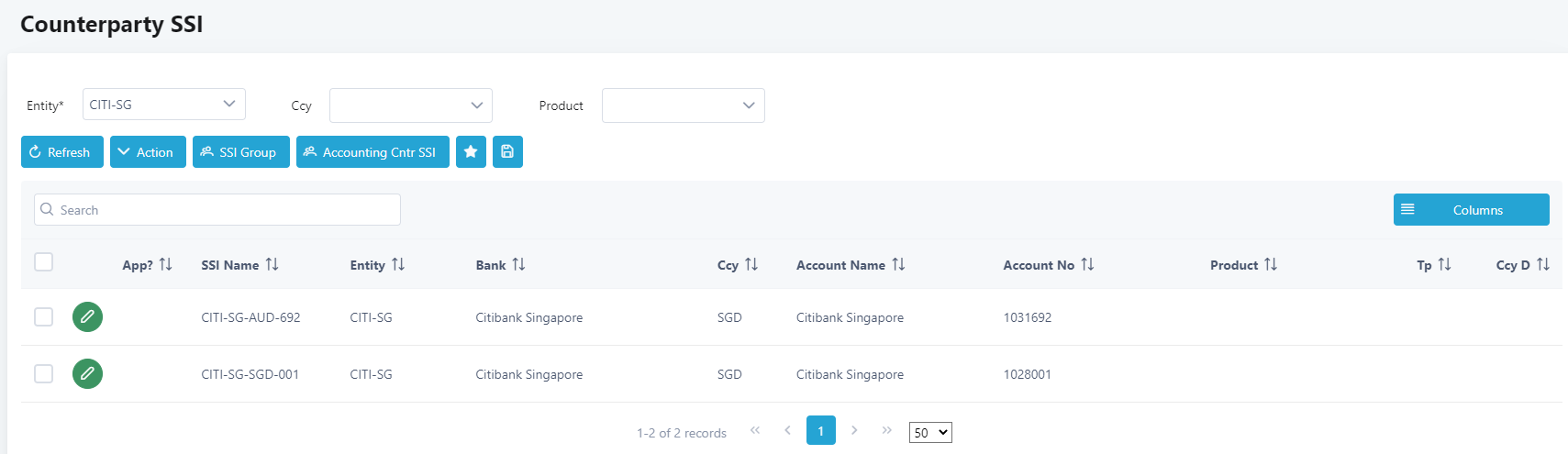5. Select the SSI to be changed by clicking on the Edit button. In this example, CITI-SG-SGD-001 will be chosen.