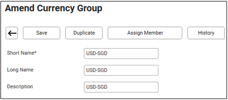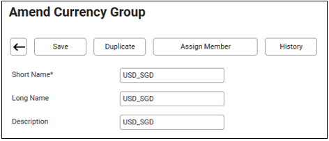 4. To amend a currency group, click on the hyperlink of the currency group short name. Amend Currency Group screen displays.