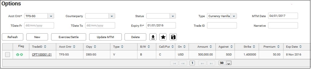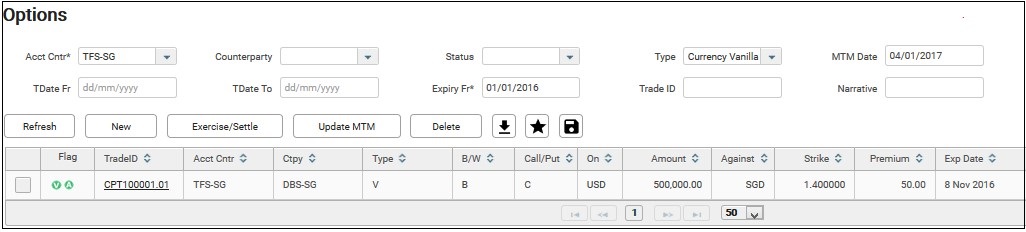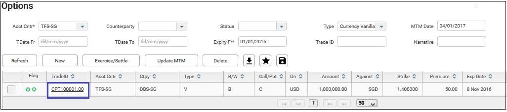 1. From the Options main screen, click on the TradeID of the Options trade to change. In this example, the Currency Vanilla Options trade with TradeID CPT10001.00 will be chosen.