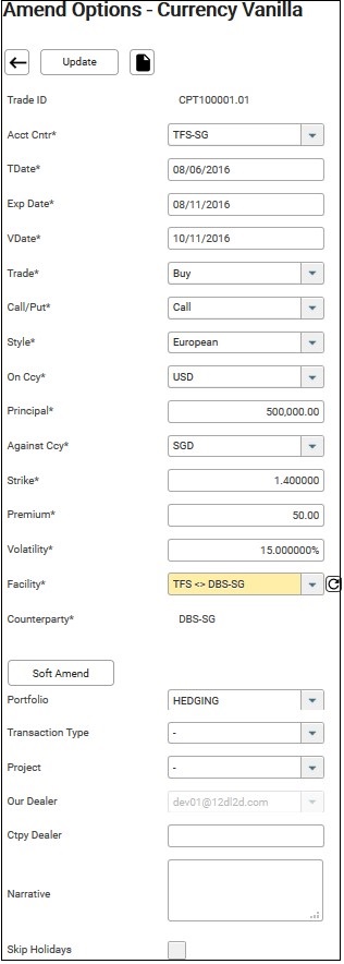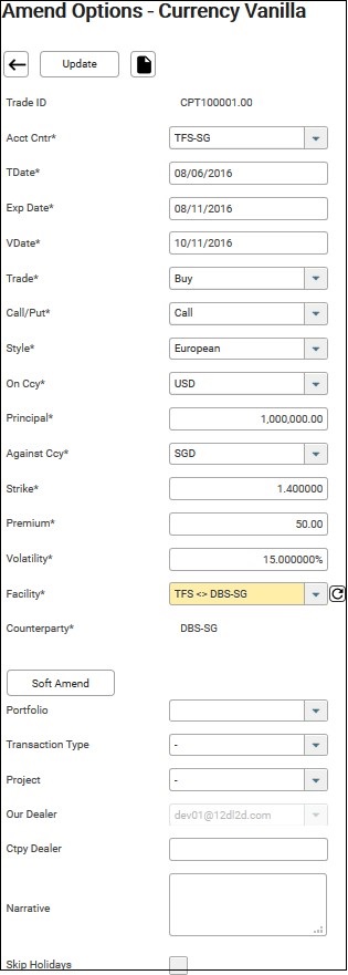 10. The system will display the Options main screen. Note that the TradeID would remained the same because this is a Soft Amend.