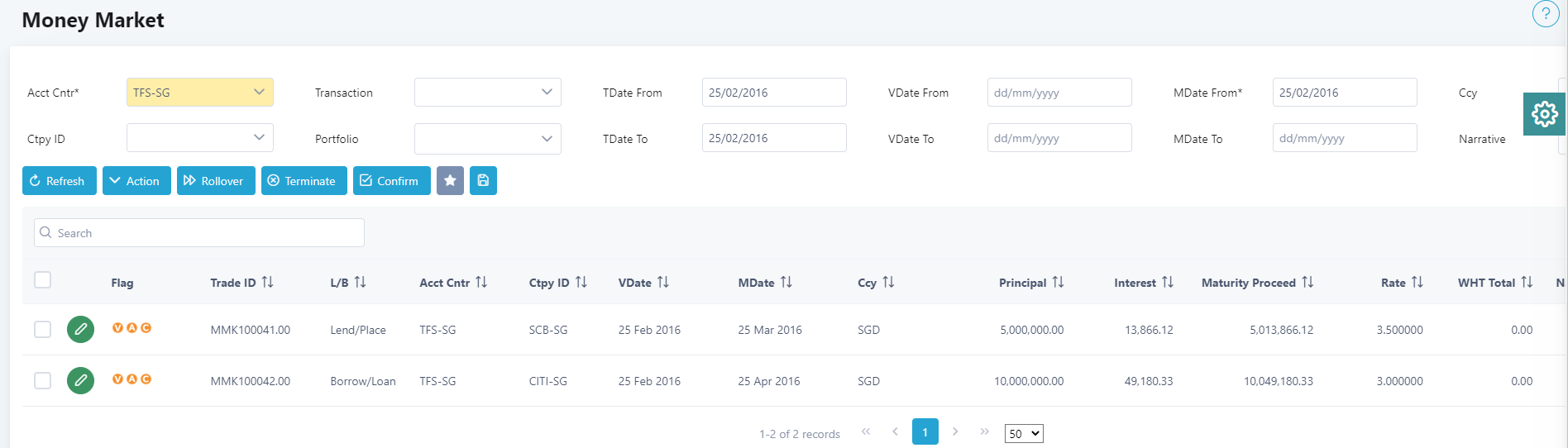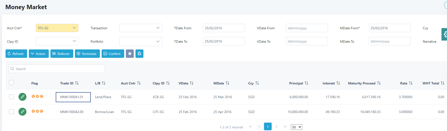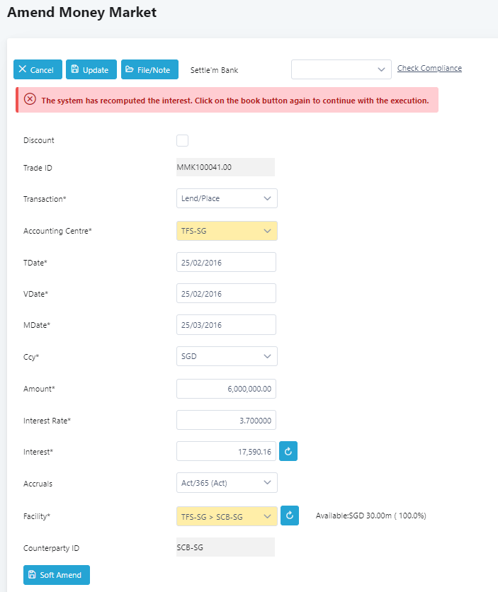 10. The Money Market screen will be displayed, the amended transaction appears with a change in the Trade ID.