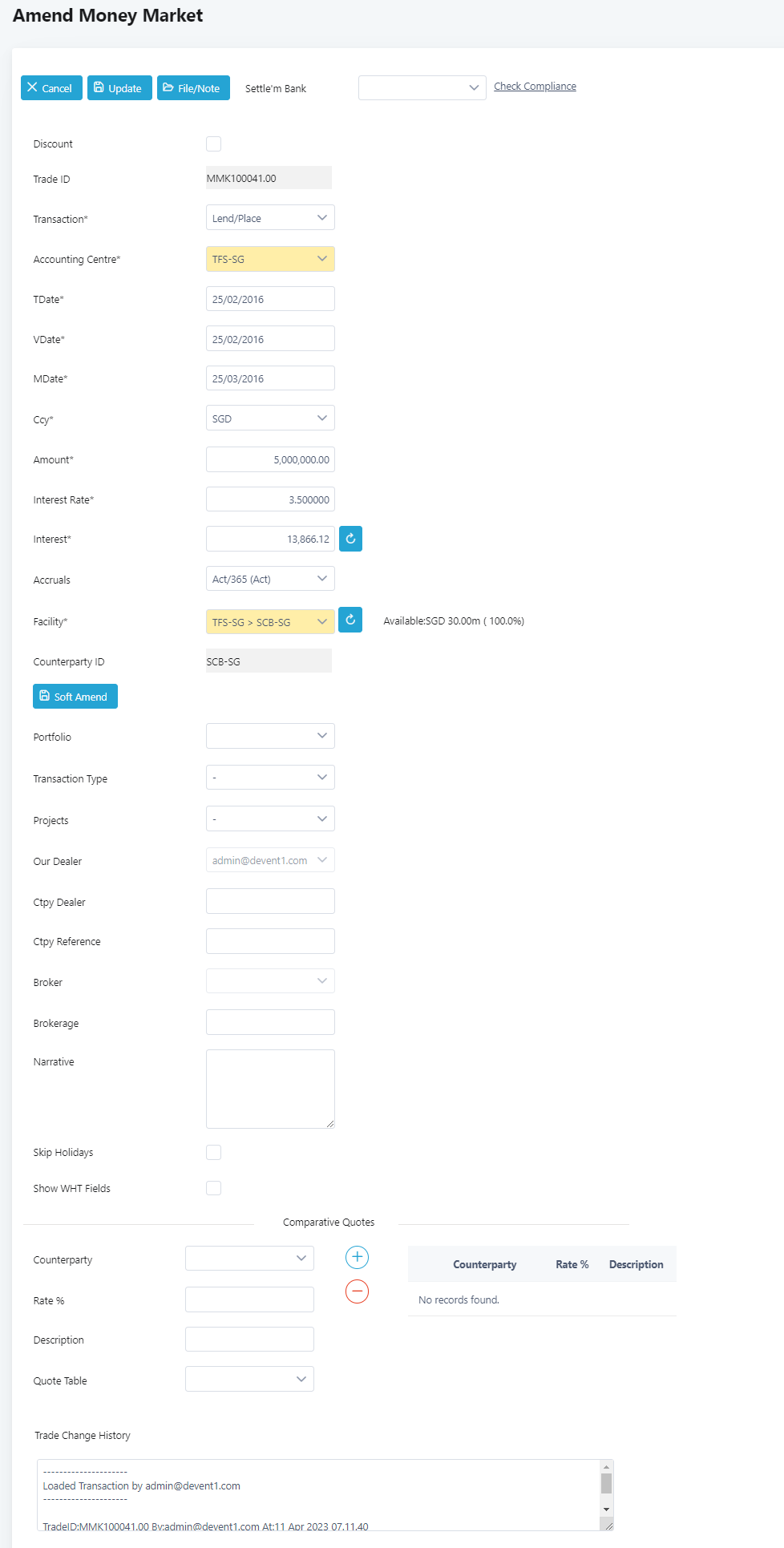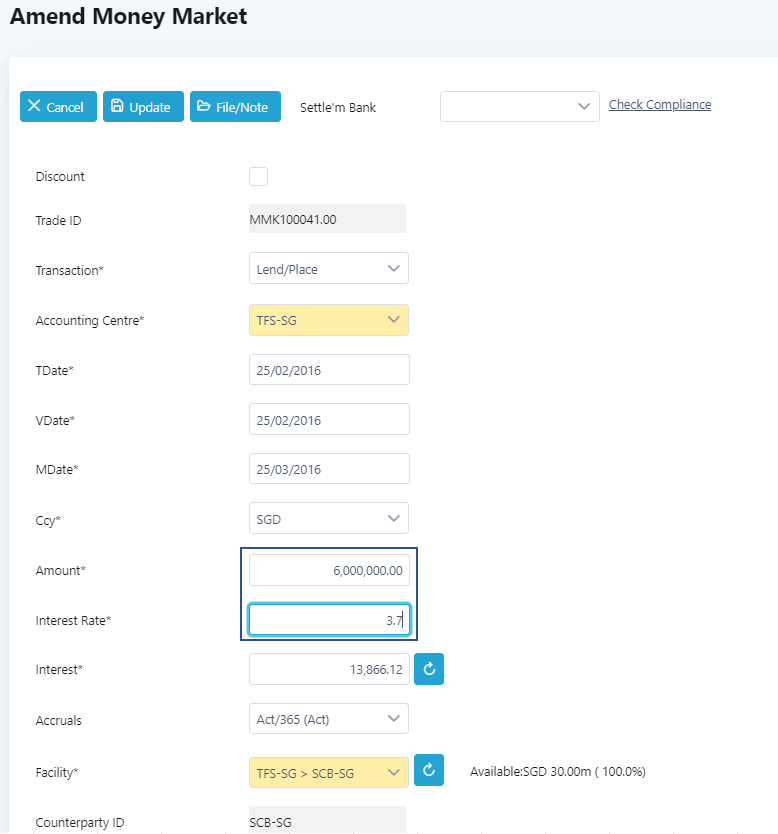 3. Select the transaction to amend by clicking on the Edit button. The Amend Money Market screen is displayed.