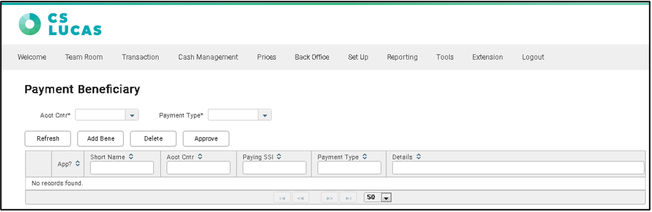 Tip: If you do not see the Payment Beneficiary in the menu navigation, please ensure that you have the access rights to access this screen. Access rights required is 19800 Access Payment Beneficiary.