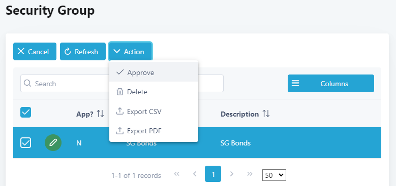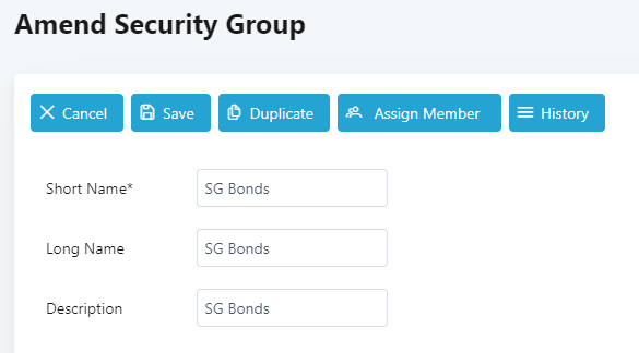 9. After all changes are made, click Save. You will return to Amend Security Group. Click Cancel button to return to Security Group screen.