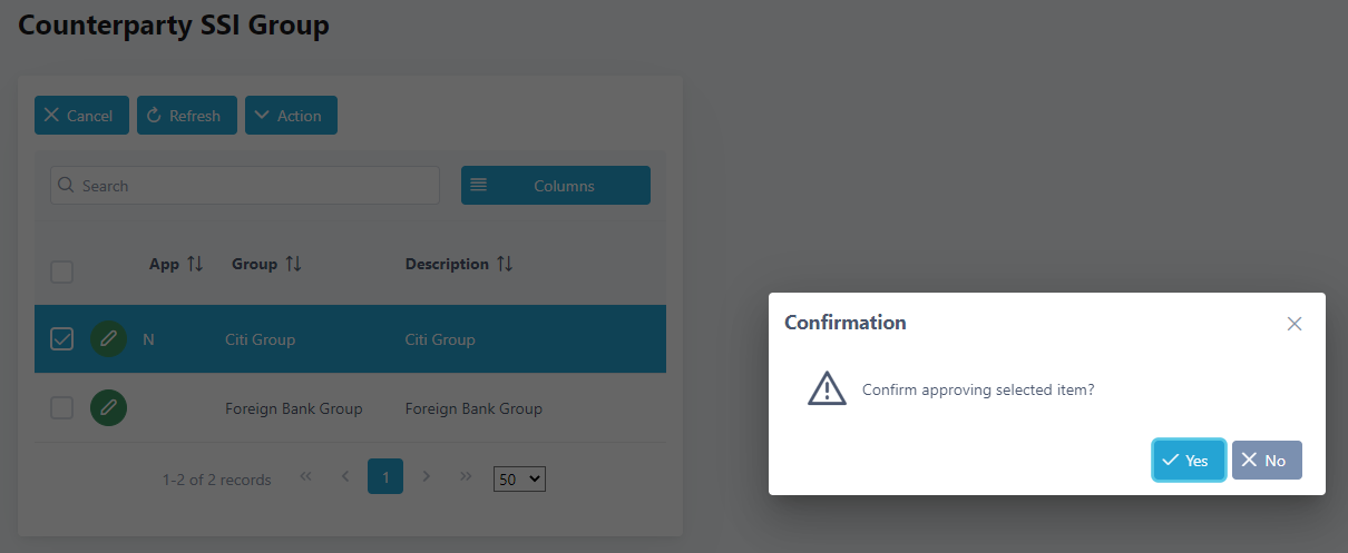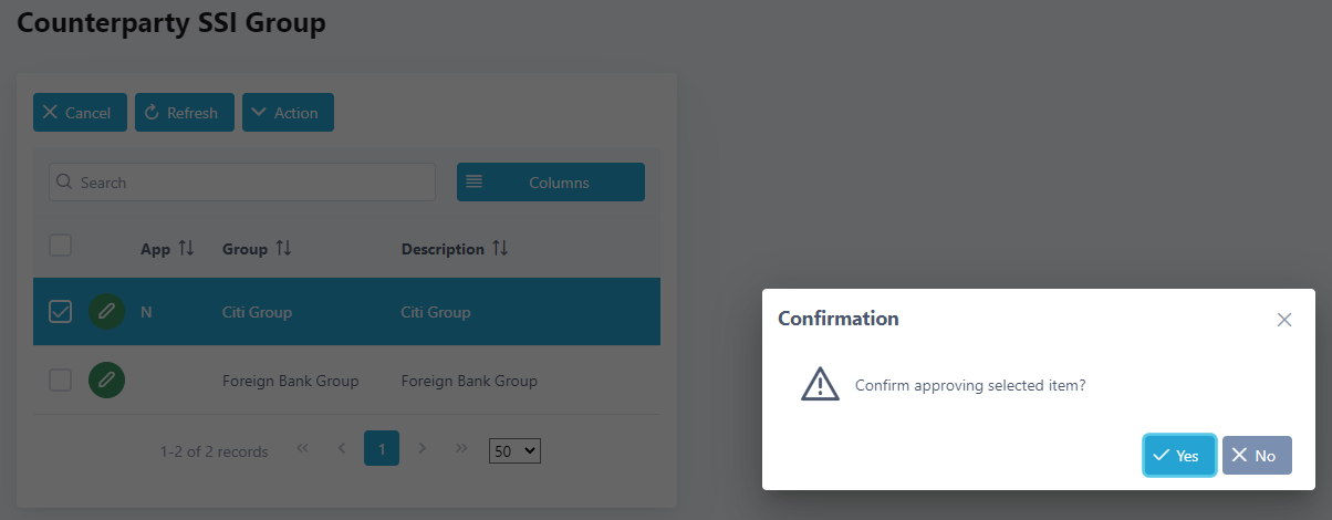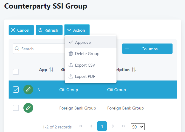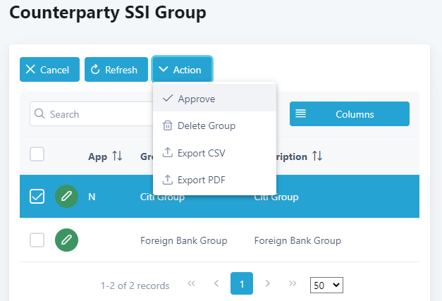 16. Approve the counterparty SSI group by ticking the checkbox beside the short name and click Action and Approve. If you do not see approval status set to “N” after making changes for the counterparty SSI group, click Refresh to refresh the screen.