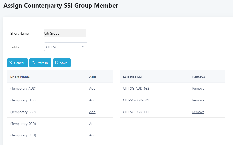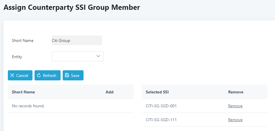 12. To add more counterparty SSI to the group, select the entity from the drop down and click Refresh to view the list of counterparty SSIs. Then, click Add hyperlink next to the short name of the counterparty SSI on the left.