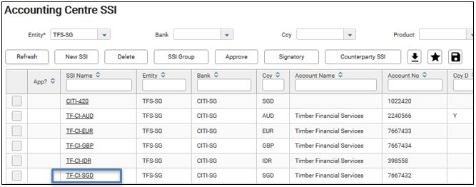 1. From Accounting Centre SSI screen (Set Up > Static > Settlement Instructions), click on the SSI Name (e.g. TF-CI-SGD) to drill down to Amend Acct Cntr SSI screen.