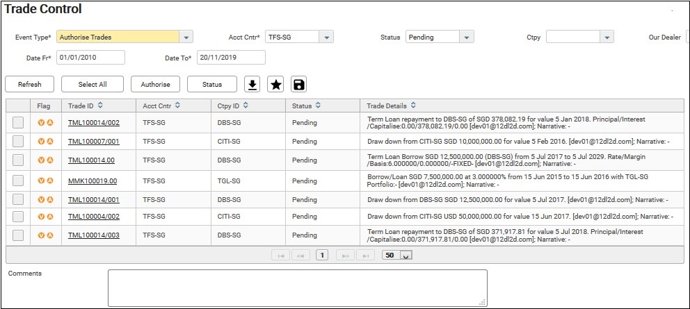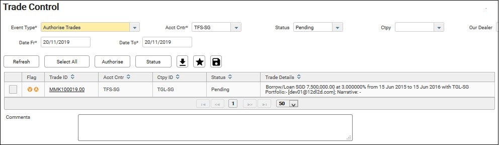 Click Refresh. The system refreshes the screen with the list of transactions that are pending for authorization for the current date. In this example, there are four trades that are pending for authorization on 20-Nov-2019.