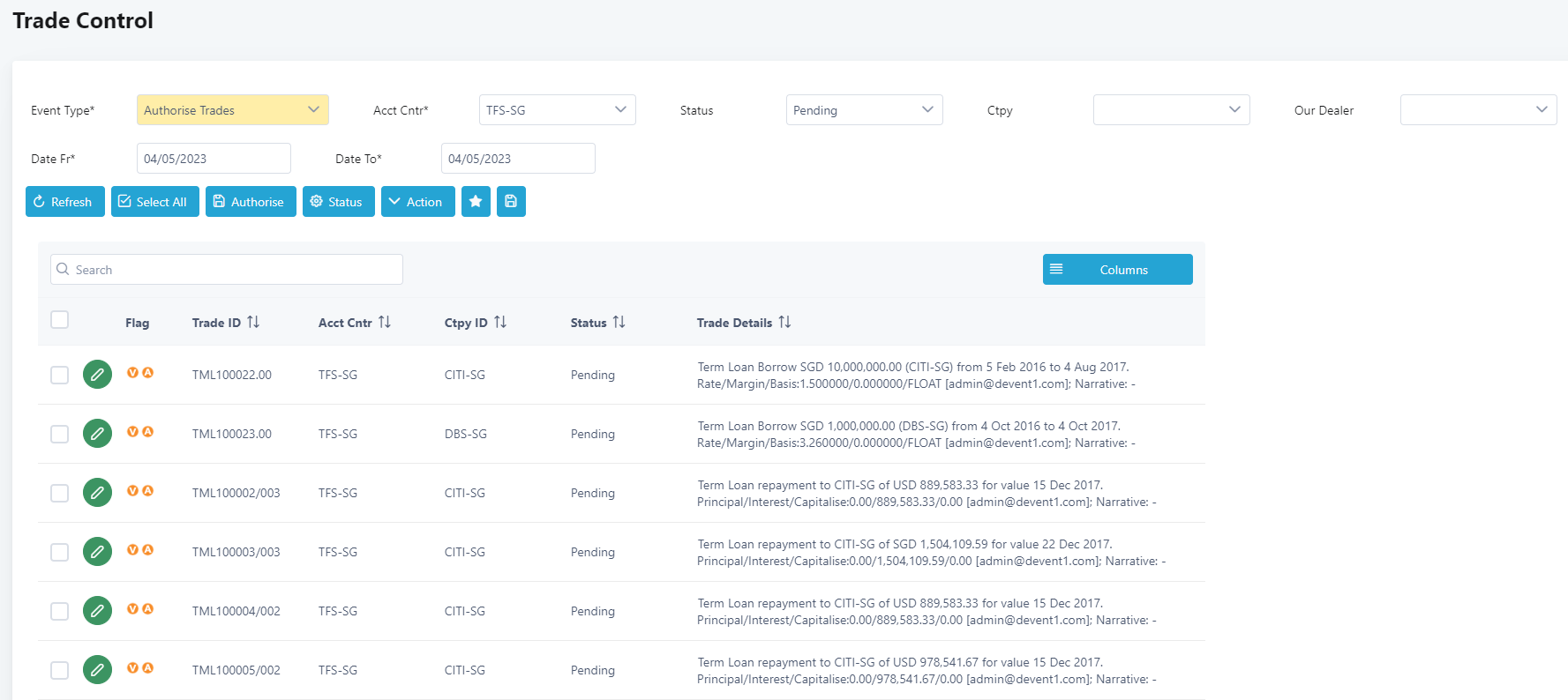 3. The Trade Flow Control module will list all pending authorizations and verifications, if any.