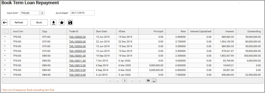 9. If you see an asterisk (*) in front of the Acct Cntr field, it signifies that the trades having a preceding item not booked in the Repayment Schedule. You need to book the preceding item before you are allowed to book this.
