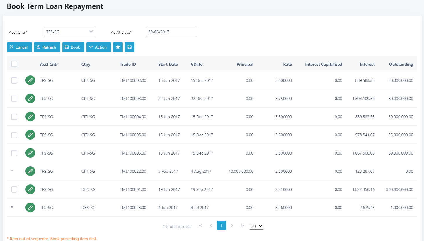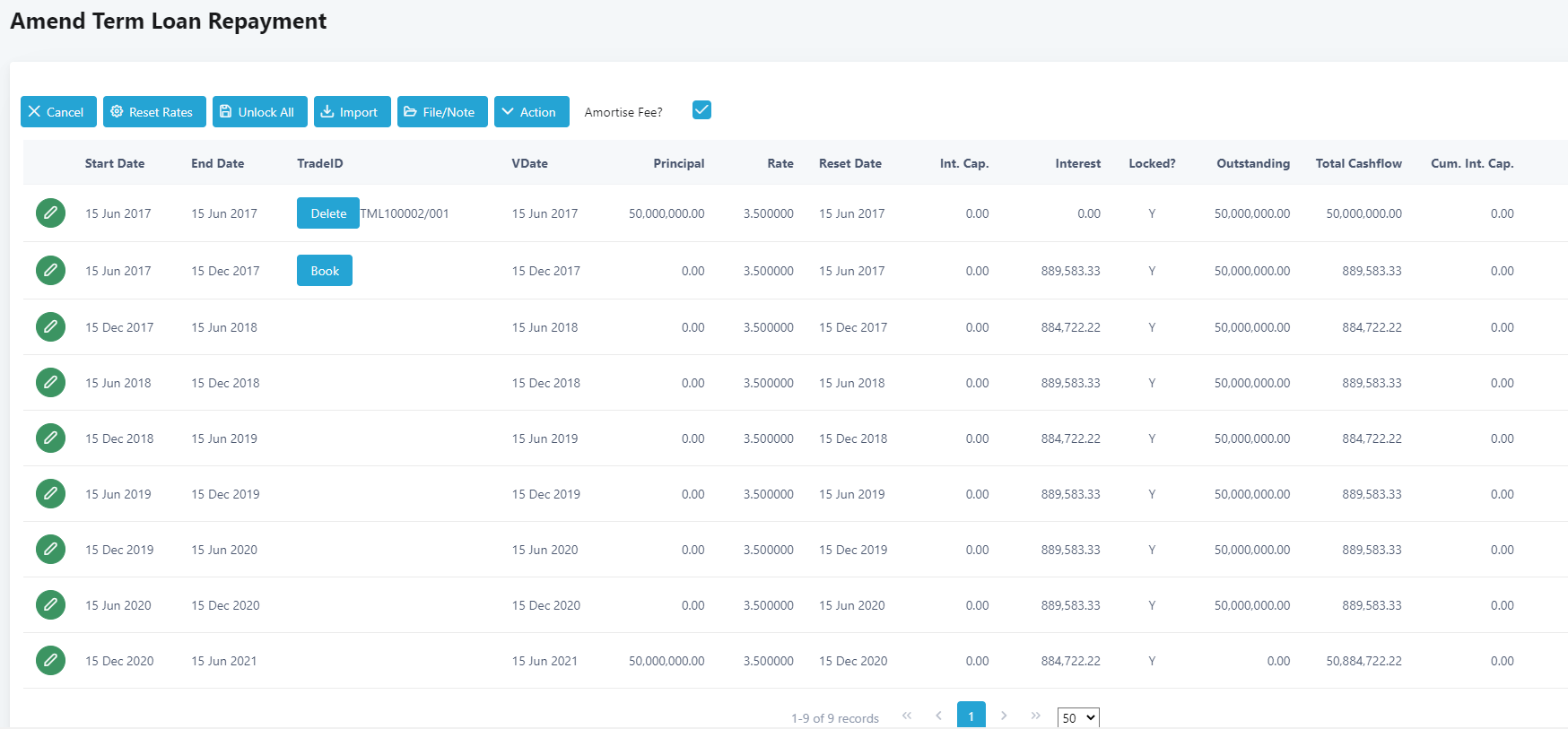 10. To view the repayment schedule of a term loan trade from this screen, click on the Edit button of the trade. You will be brought to the Amend Term Loan Repayment screen. You can also book the repayment item directly from this screen. In this example, TML100002.00 is selected.