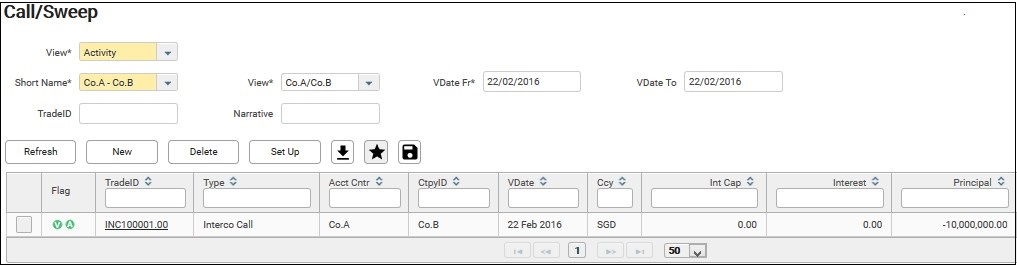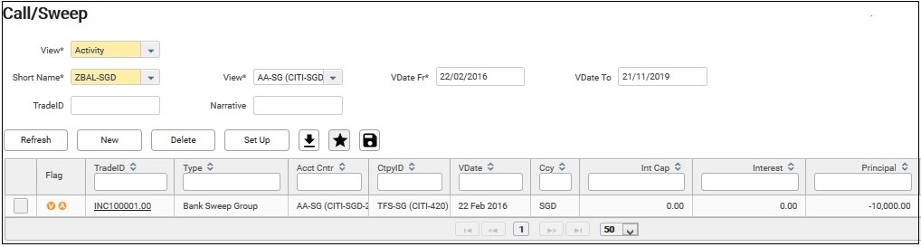 It provides details and overview of the cumulative balance/ position of the interco/ external call and sweep activities of the bank sweep group. It also allows you to manage interest between inter-company pair, call deposit account and bank sweep group.