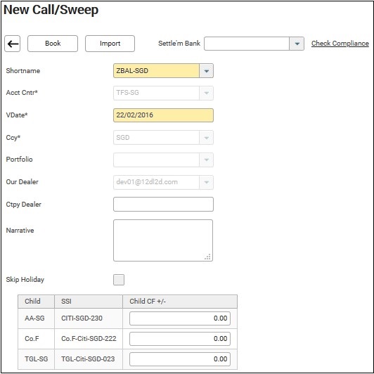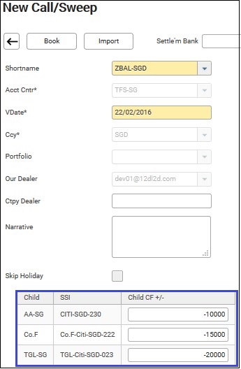 The accounting centre of the master sweep SSI and the currency of the bank sweep group will be populated. The members of the sweep group are shown in the table below the fields in the booking screen.