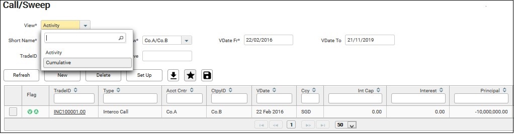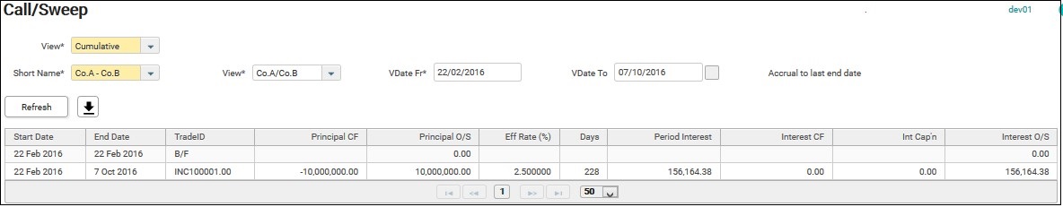6. To view all transactions made on the inter-company transaction, call deposit or bank sweep on cumulative basis and check the interest accrued, Cumulative may be chosen from the View field.