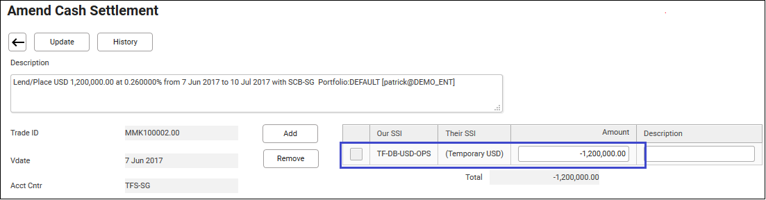 4. In this example, we will change the Our SSI from TF-CI-USD to TF-DB-USD-OPS. This means the amount 1.2 million will be debited from TF-DB-USD-OPS instead of the previous SSI.