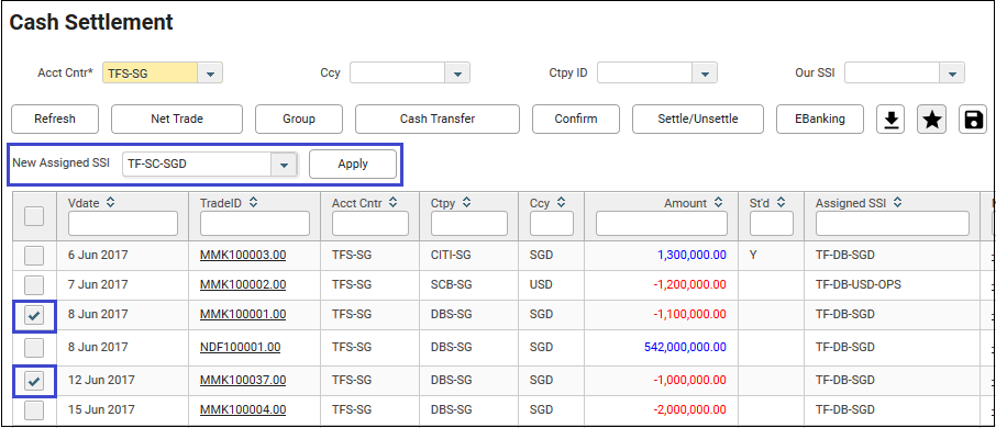 16. You will see new SSI applied successful message and the Assigned SSI is updated for the selected cash settlement items.