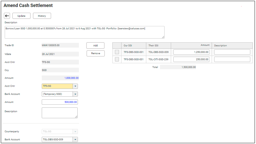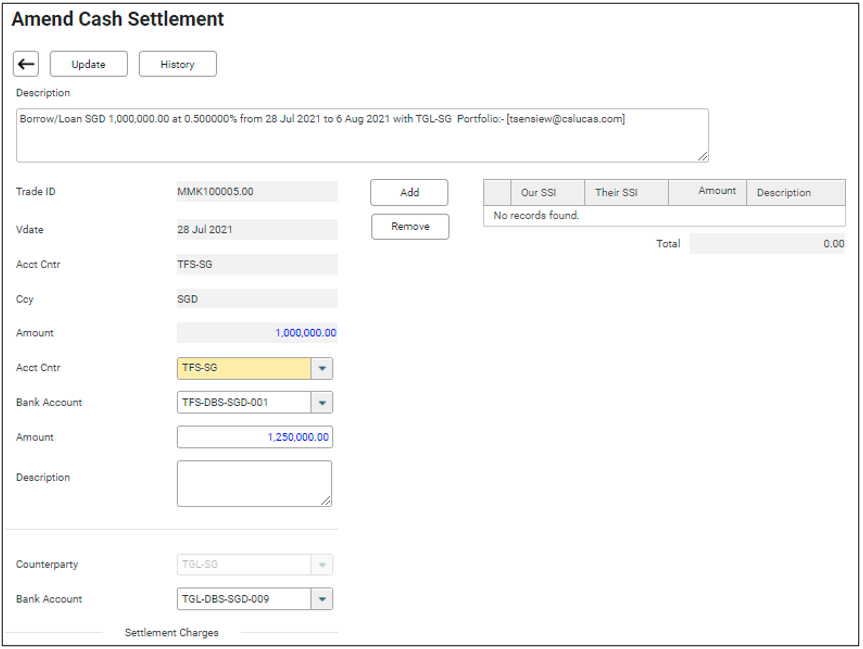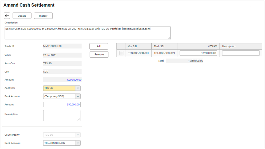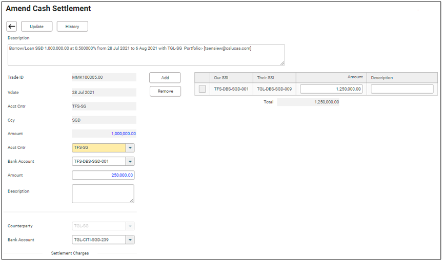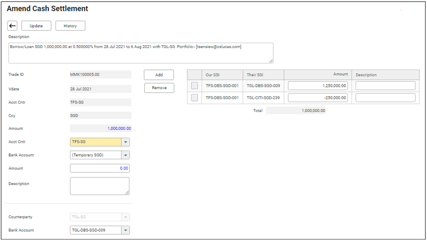 The example below shows how to split settlement amount of S$1,000,000 to two settlements, i.e. S$1,250,000 and -S$250,000 in Cash Settlement.