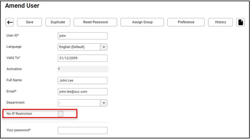 1. CS Lucas checks that whether your User Set Up has IP address restrictions. If “No IP Restriction” setting is disabled, only IP address that is within the Trusted IP Range is allowed. See how to set up trusted IP range. Tick on the checkbox for “No IP Restriction” to enable no IP restrictions for a user.