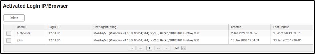 4. To remove an activated login IP/ browser, select the checkbox and click Delete.
