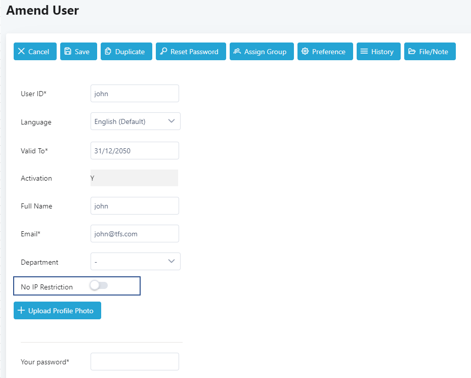 1. CS Lucas checks that whether your User Set Up has IP address restrictions. If “No IP Restriction” setting is disabled, only IP address that is within the Trusted IP Range is allowed. See how to set up trusted IP range. Tick on the checkbox for “No IP Restriction” to enable no IP restrictions for a user.