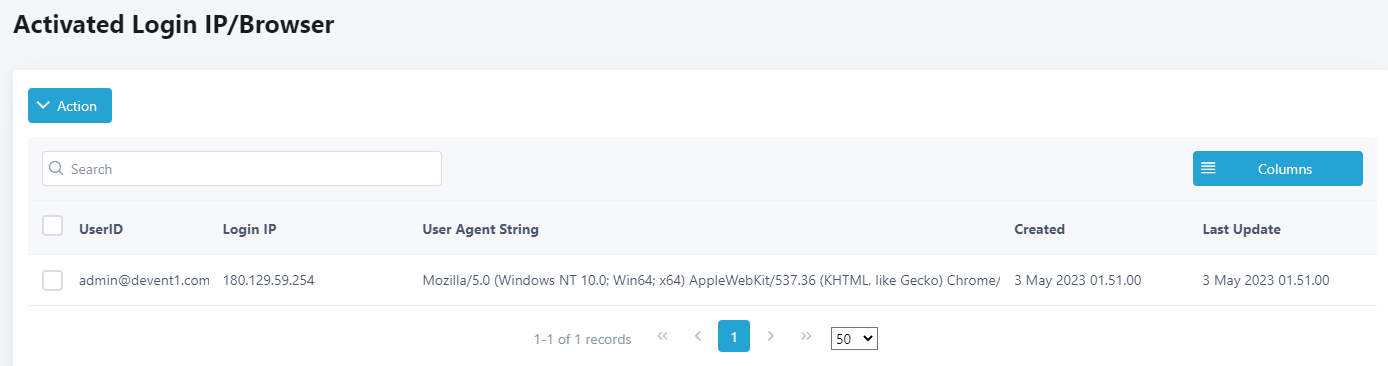 4. To remove an activated login IP/ browser, select the checkbox then click Action and select Delete.
