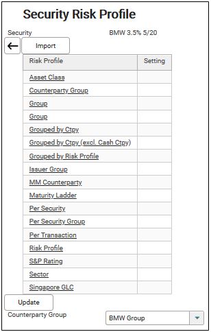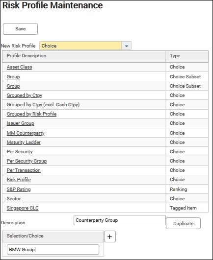 Enter selection choices for Counterparty Group risk profile. In this example, “BMW Group”.