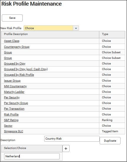 Enter selection choices for Country Risk profile. In this example, “Netherland”.