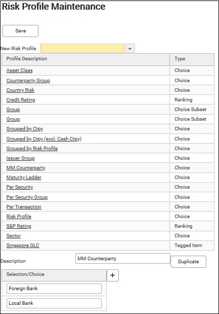 Enter selection choices for MM Counterparty risk profile. In this example, “Local Bank” and “Foreign Bank”.