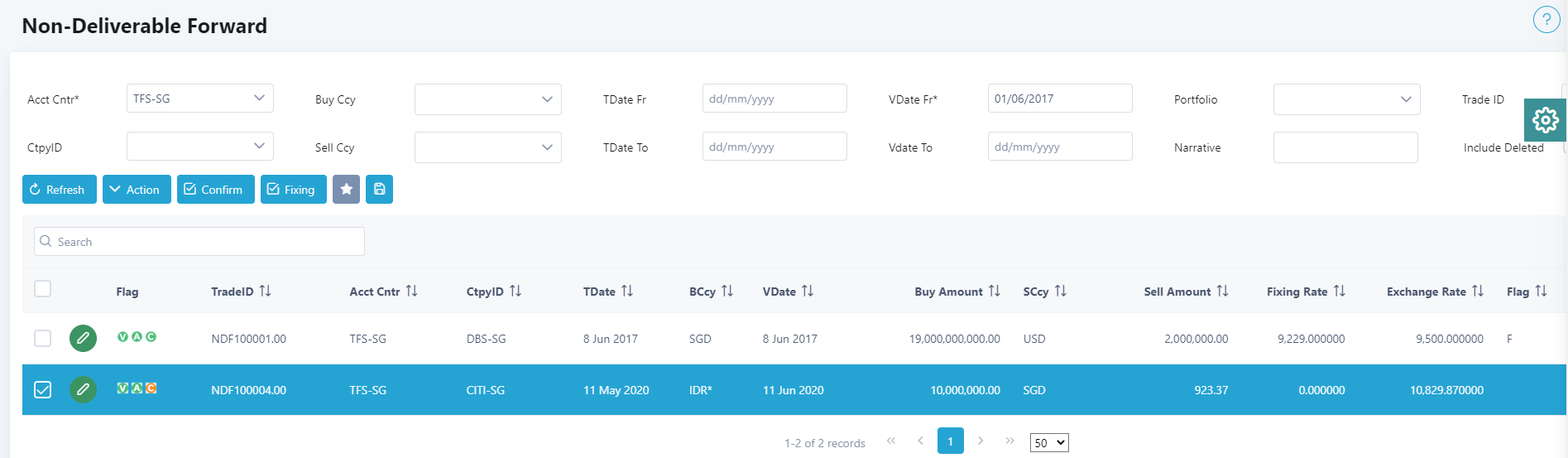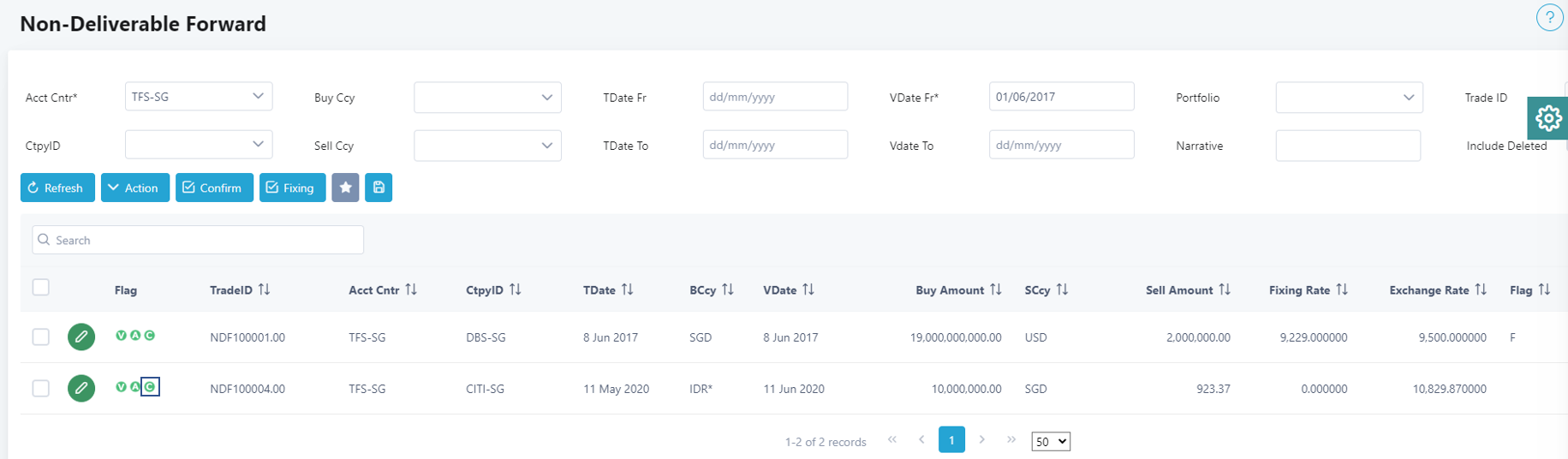 9. Click Cancel button to return to the Non-Deliverable Forward listing page. Notice that the C in the Flag is now in green, which means it is confirmed.
