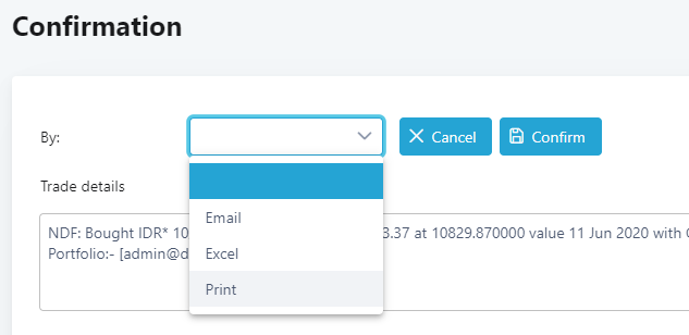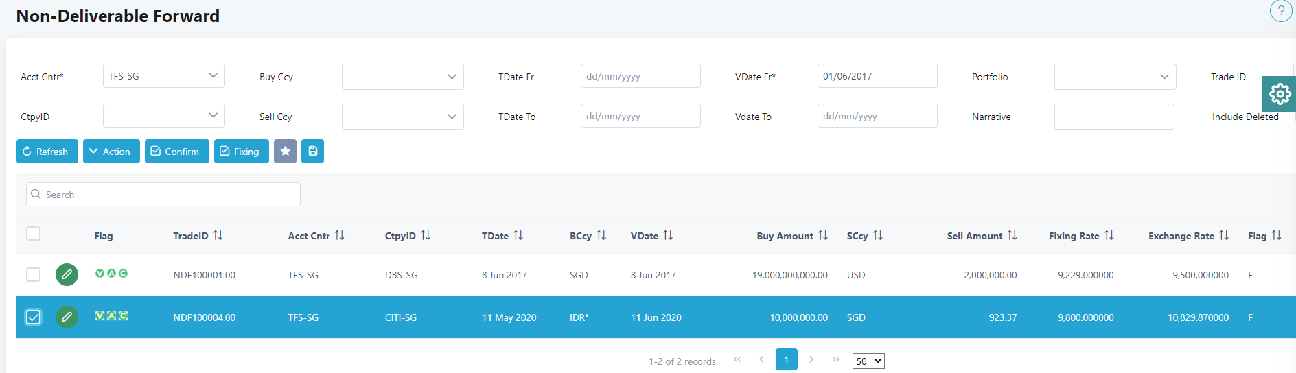 1. From the launch screen of the non-deliverable forward module, tick on the checkbox beside the trade ID to confirm.