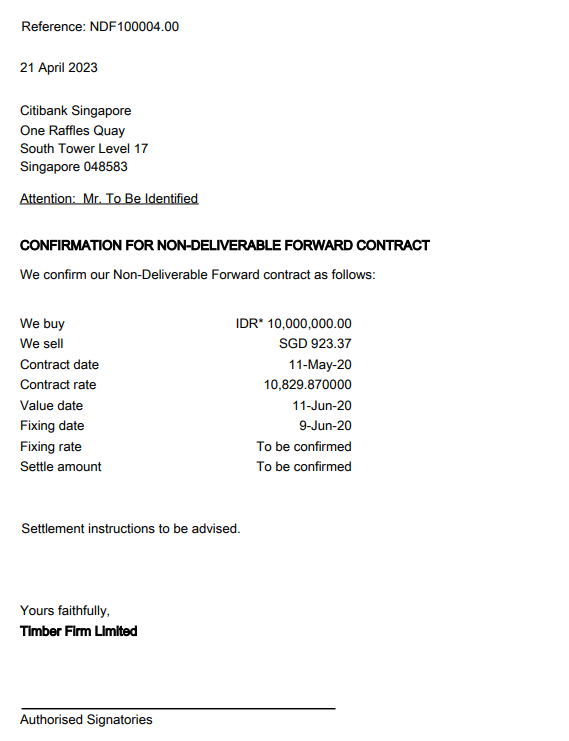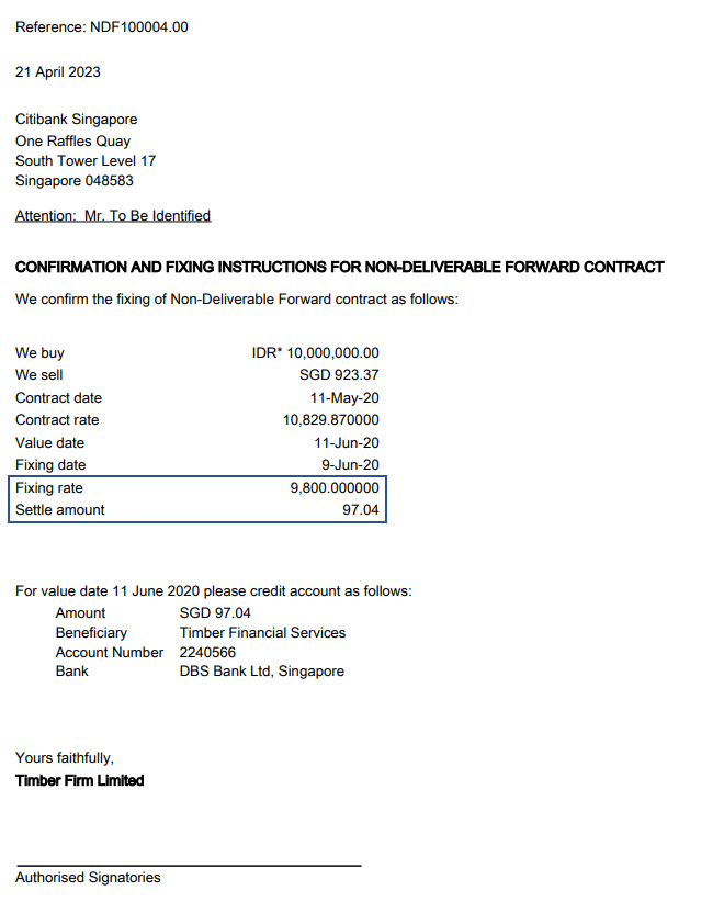 13. The non-deliverable forward fixing letter in PDF will be displayed. Notice that, unlike the previous confirmation letter, the Fixing Rate and Settlement Amount is now determined.