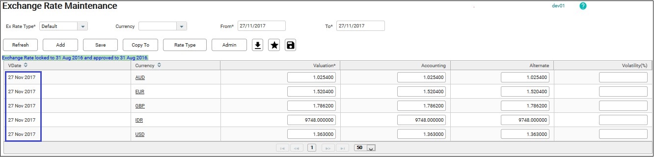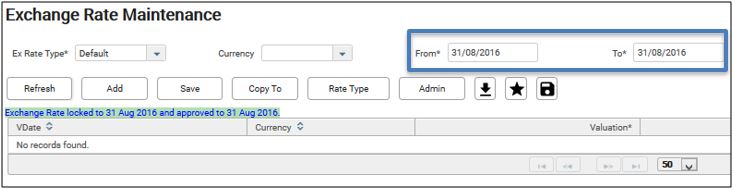 2. For example, we want to copy exchange rates from 31-Aug-2016 to 27-Nov-2017. In the Exchange Rate Maintenance screen, choose/ enter the From and To date fields as 31-Aug-2016.