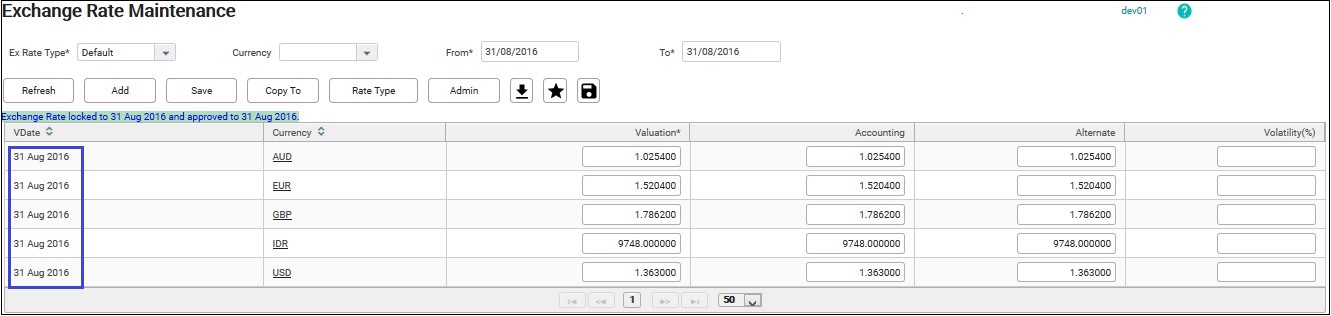 5. You will see the rates are copied to the new date on the screen. Any amendments to the exchange rates can be made directly on this screen.