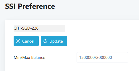 Min/Max Balance | This defines the minimum and maximum balance a user wishes to set for the SSI, with the currency matching the SSI Currency. It is used in the Dashboard – Cash Visibility 1426.