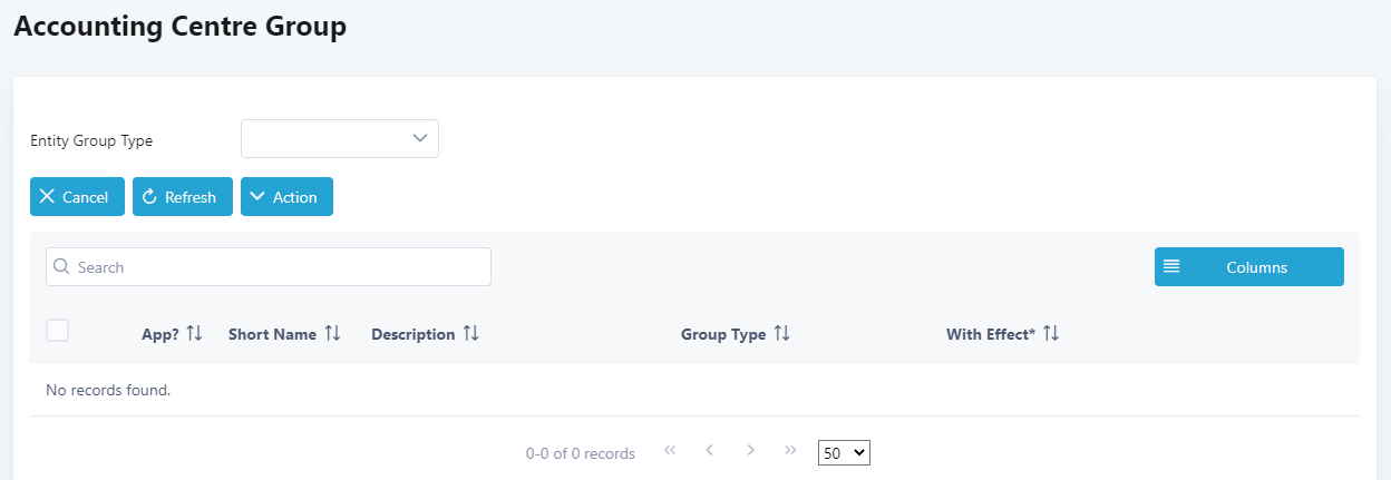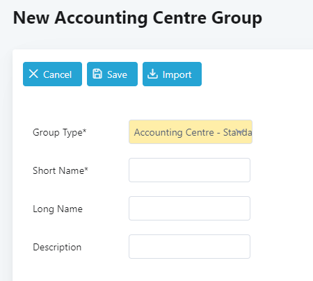 3. Click on Action and select New Group to go to New Accounting Centre Group screen.